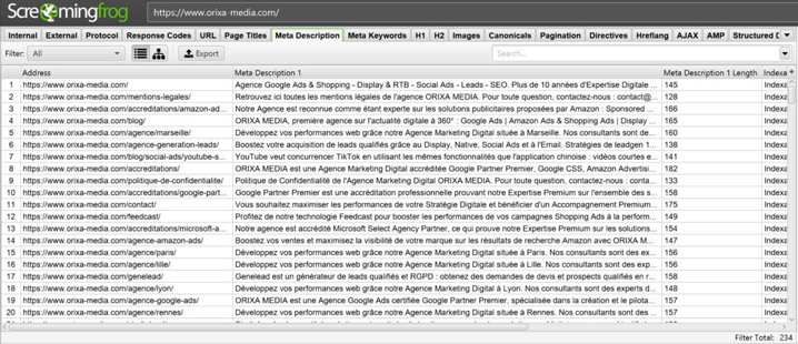 Ainsi, après avoir lancé une analyse de votre site, vous obtenez, dans l’onglet dédié intitulé “meta description”, le détail de toutes les balises correspondantes rencontrées par l’outil lors de son crawl.
